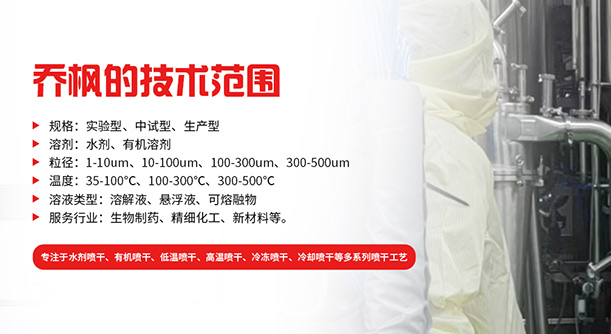 上海喬楓實業有限公司,成立于2012年,是從事噴霧干燥設備的研發設計、生產、銷售(小型噴霧干燥機,實驗型噴霧干燥機,35℃低溫噴霧干燥機,有機溶劑噴霧干燥機,低溫閉式循環噴霧干燥機、超細粉末噴霧干燥機、噴霧冷凍干燥機、真空噴霧干燥機、氣流噴霧干燥機,噴霧造粒干燥機,離心噴霧干燥機,沸騰制粒機等)和售后于一體的綜合性公司,本公司現成為一家致力于為生物制藥、精細化工、新能源、陶瓷造粒及食品工程等領域提供全套解決方案的整線交鑰匙工程企業。